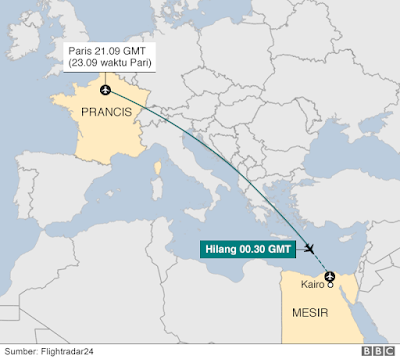 - Pesawat EgyptAir MS804 hilang dari pantauan radar, saat terbang di ketinggian 11,300m, di Mediterania bagian timur atau sekitar 16 kilometer dari wilayah udara Mesir